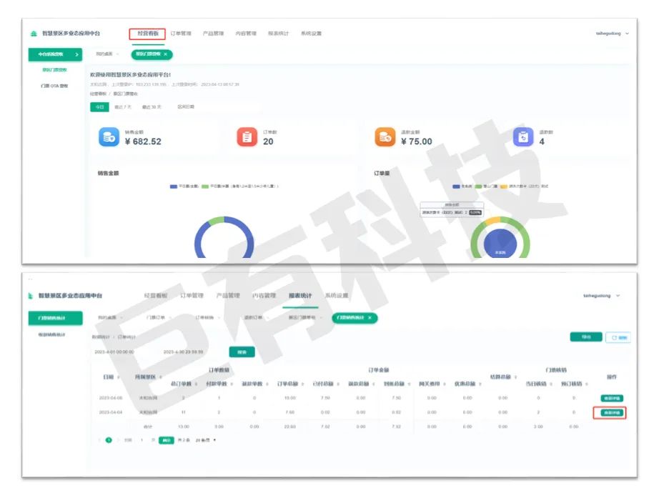 对于太和古洞景区而言,景区信息化建设意味着景区庞大的数据得到了快速整理和汇聚,入园高峰时间、入园人数、景区项目消费金额、项目订单数、退款率、线上订单数、线下订单数、员工分销等。这里的每一个环节都会形成一个数据表报,方便财务下载汇总进行月度的财务统计工作汇报,让景区的运营方根据这些数据来调整景区的运营。