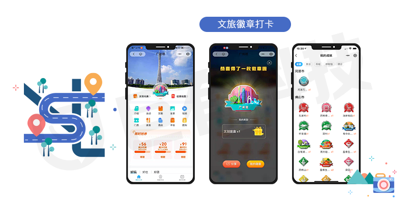 文旅徽章打卡以“游玩轨迹”的形式设置文化和旅游地标线索,引导游客前往制定城市/景区地标景点,点亮徽章,最终集齐一套旅游”纪念徽章。徽章打卡活动还附有游玩指导、优惠抵扣、奖励机制、社交互动、收藏纪念等多项功能。集齐徽章还能获得相关打卡点的文创纪念品免费兑换,餐饮、住宿、购物、景点门票的现金抵扣券和免票优惠等。
