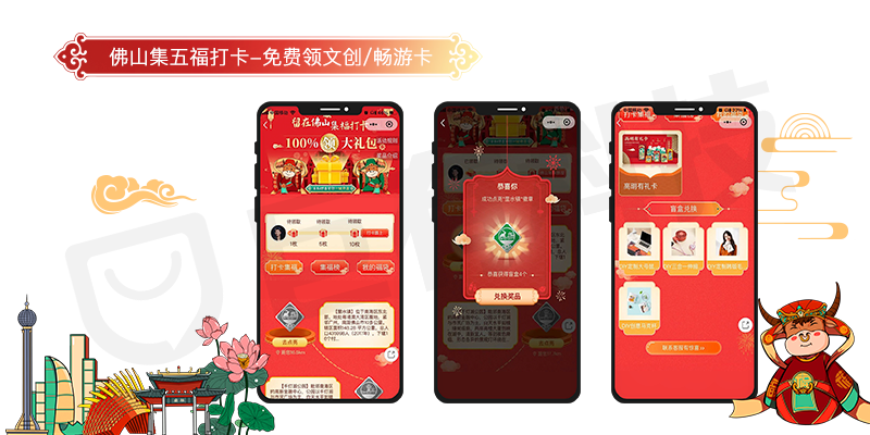 佛山市两次入选中国最具幸福感城市(地级市)榜单,拥有数以百万计的务工人员。为响应国家号召,让游客和市民群众感受浓浓的佛山岭南年味,策划推出2021“岭南味 佛山品”新春文旅欢乐季活动,巨有科技作为技术服务方,共同参与并策划出“领旅游徽章,打卡集五福”项目。