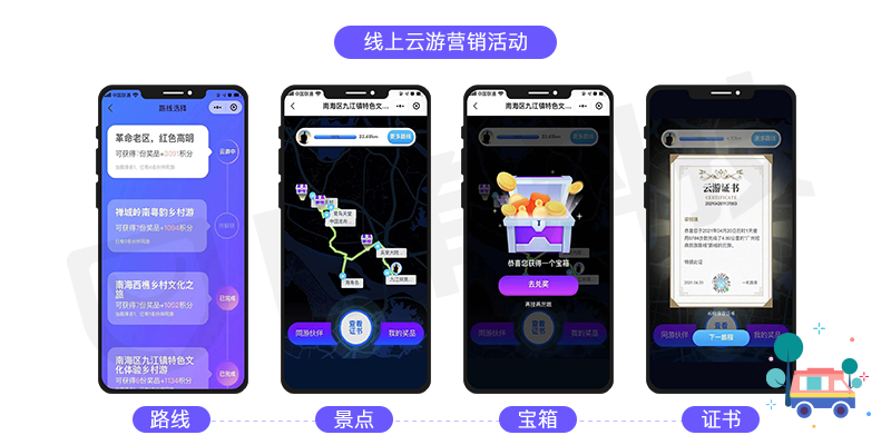 相同的路线下,游客可通过每日签到,或用每天的步数兑换里程,进行线上云游佛山景点路线,每到达一个景区系统即随机弹出一个宝箱随机开出不同的文创纪念品。集齐一条路线的证书,还能通过分享朋友圈获得相应奖励,线上云游的活动玩法让用户足不出户,也能通过线上云游佛山景区。线上云游营销活动结合了本地景区、文化加强线上互动,用户可宅在家中免费体验百余家景区,部分景区还配有真人语音导游,彷佛身临其境。免费开宝箱赢好礼让线上云游更添神秘和趣味性,吸引游客参与的同时,也为景区带去线上流量。