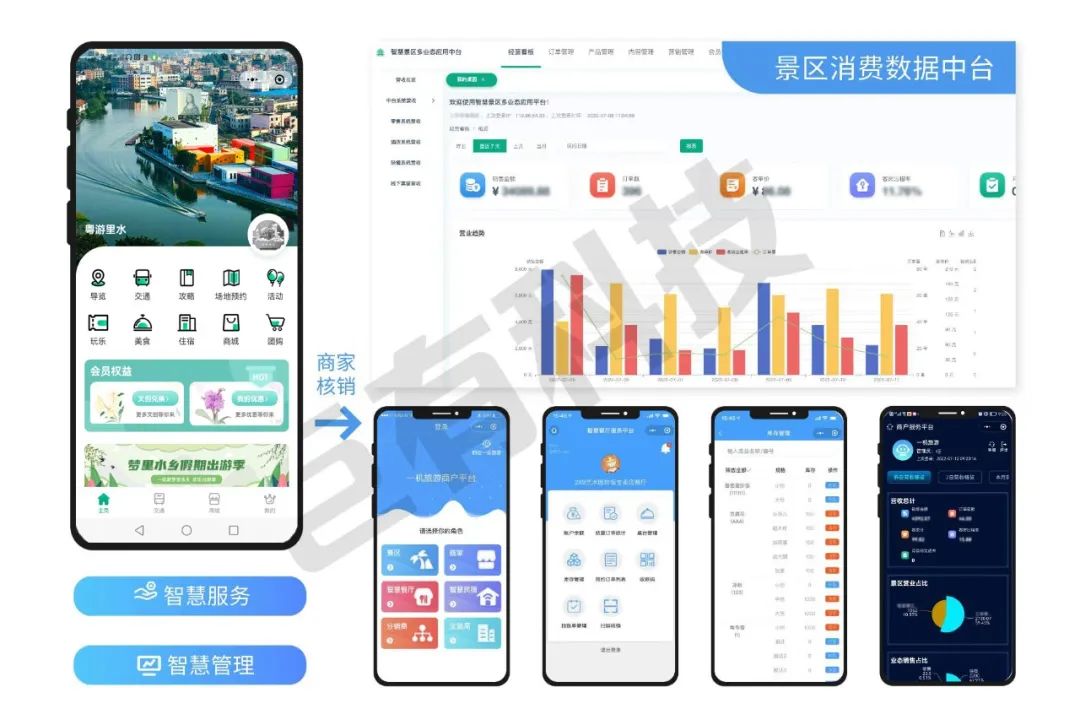 多业态管理中台以员工手持端、综合管理中台相互串联工作,围绕景区商家统一支付、核销后,交易数据汇聚到管理后台,形成庞大的数据统计,进行景区数据的全面展示、采集、储存和分析,由此管理者即可对乡村产业进行精细化运营。