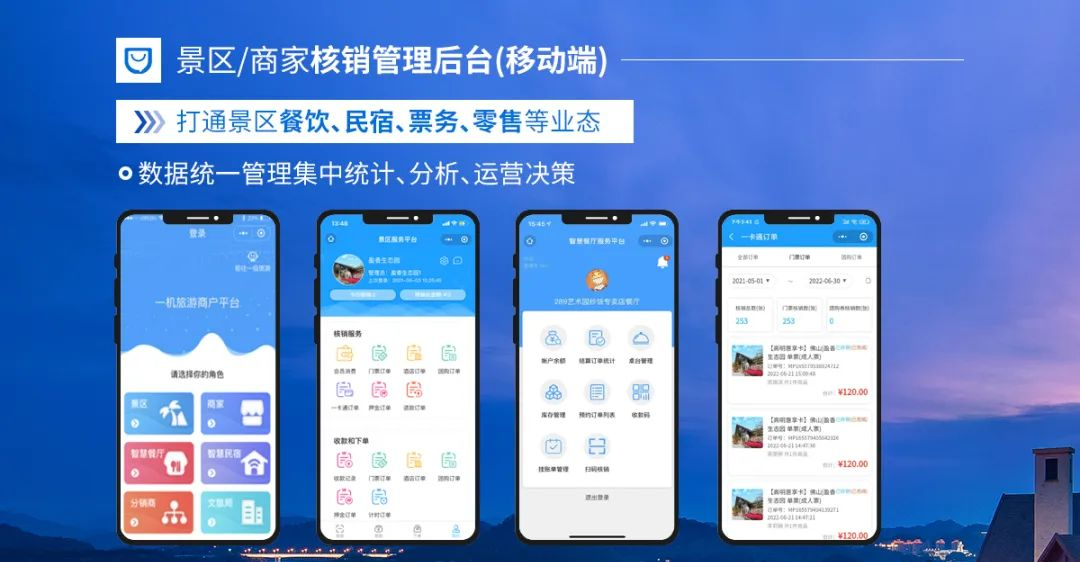 商户端后台划分了景区、商家、餐饮、民宿、分销商、大数据系统板块,景区商家可以进行角色,针对游客的线上订单分别进行票务核销、团劵核销、餐饮核销、酒店核销、游乐设备核销等,在景区各场景也发挥了巨大的作用。