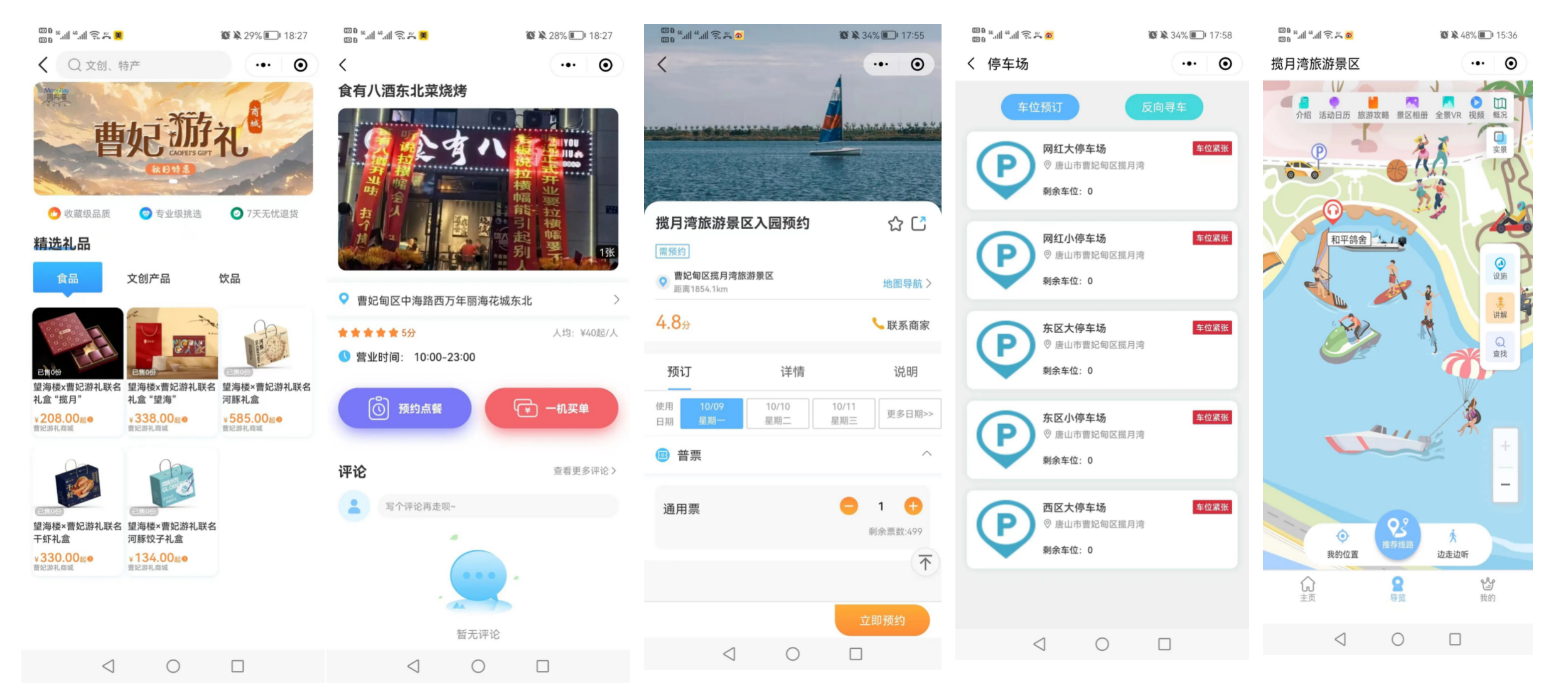 揽月湾景区有着酒吧、餐厅、烧烤、酒楼等景区美食,游客在景区游玩时,为其提供预约点餐、到店扫码点餐、一键点餐,餐后一键买单等功能。