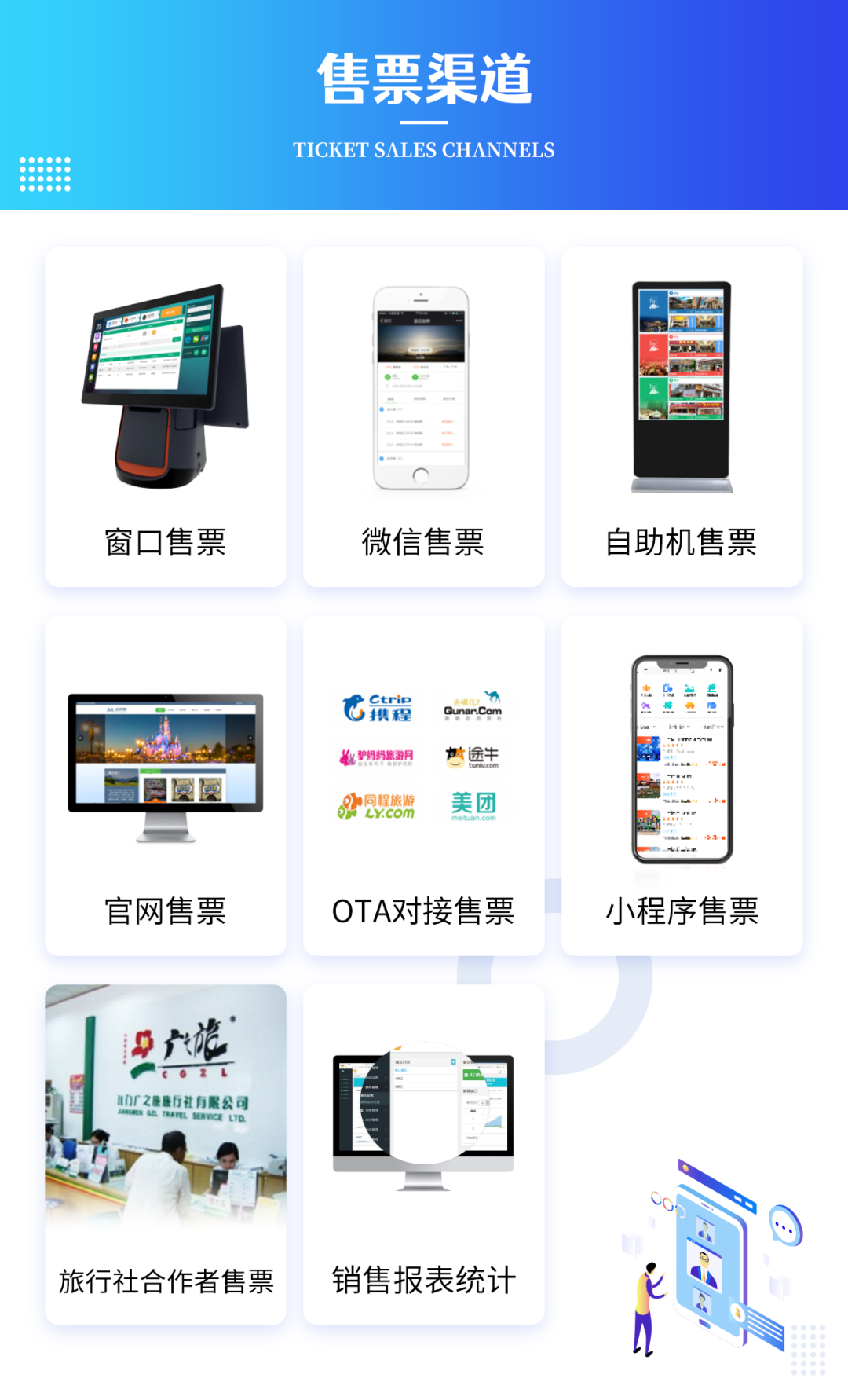 系统支持OTA对接,使用OTA售票即能为门票分销扩展渠道,同时也能为景区进行一个曝光宣传。