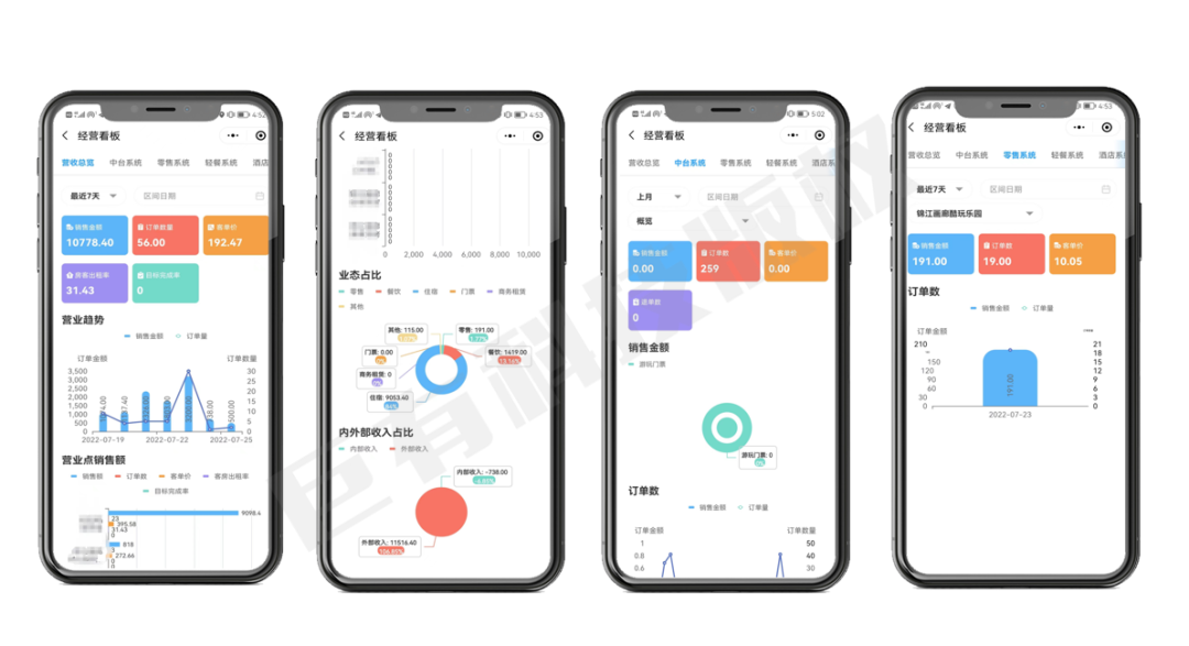 对于景区、商家管理而言,拥有一个便捷智能化的统计管理移动端,是景区、商家提升管理水平的关键之一。景区和商家分别选择自己的角色权限,后台景区业态的订单销售金额、订单数、客单数、退款、月目标完成率等销售数据,都会汇总在商户后台,景区、商家可一键查询。