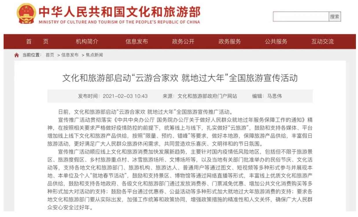 日前,文化和旅游部启动“云游合家欢 就地过大年”全国旅游宣传推广活动。宣传推广活动贯彻落实《中共中央办公厅 国务院办公厅关于做好人民群众就地过年服务保障工作的通知》精神,在按照相关要求严格做好疫情防控的前提下,统筹线上与线下,扎实做好“云旅游”,鼓励和支持各媒体、平台增加线上线下文化和旅游产品供给,按照“限量、预约、错峰”等要求,做好本地游,保障旅游产品供给,丰富假日旅游活动,更好满足广大人民群众旅游休闲需求,共同营造欢乐喜庆、文明祥和的节日氛围。