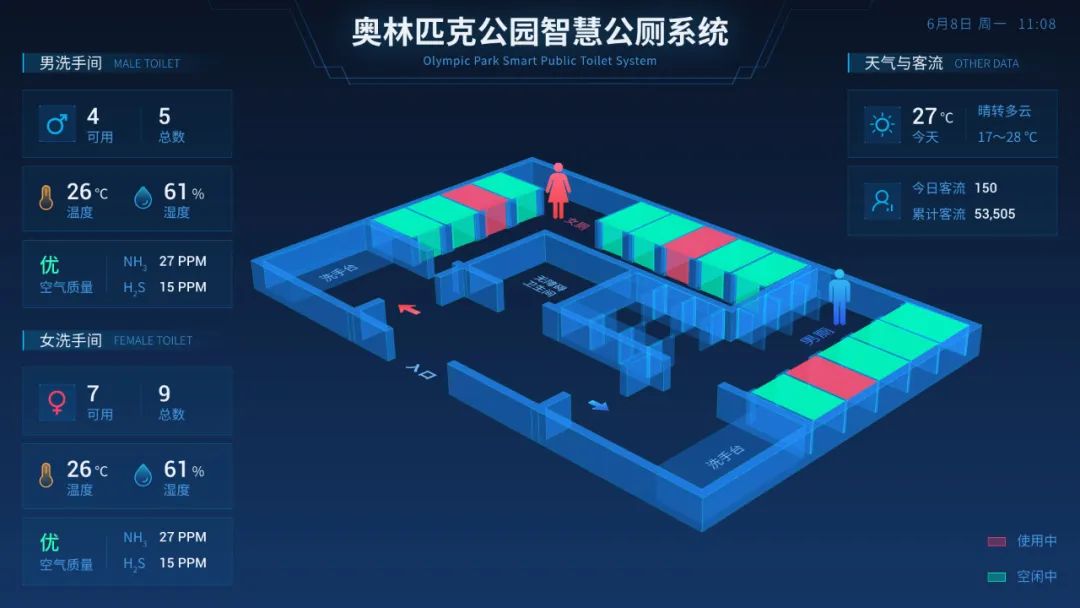 智慧引导大屏除了显示厕所内蹲位使用情况,剩余厕位数量,还会显示客流量数据,厕所内空气质量、温度、湿度、水表、电表等数据,它们都能够在大屏上可视化呈现,游客可以及时掌握厕所环境情况。这些数据可以传输至终端,为管理者的清洁、维护工作提供了数据支持,让公厕管理方提高管理效率,提升景区游客体验。
