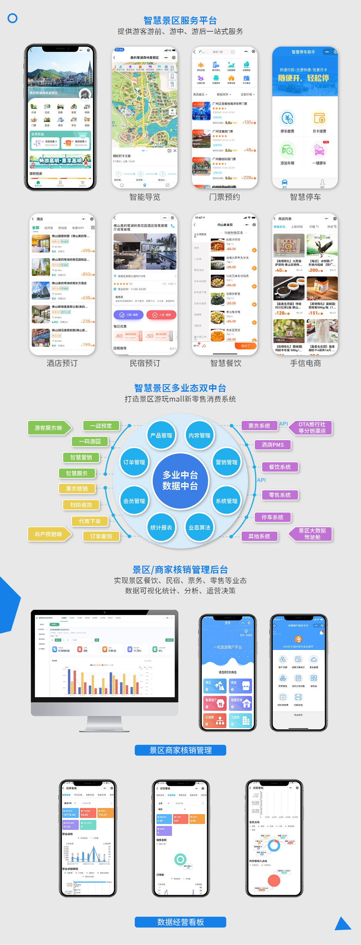 智慧景区:可分为智慧景区服务平台和多业态双中台,打通了底层应用,实现各个业态子系统的对接,并构成了“吃、喝、行、游、购、娱”旅游六要素的信息化建设的整合联动,为游客提供游前、游中、游后一站式服务,进一步提升了景区服务质量,创造良好的旅游体验。