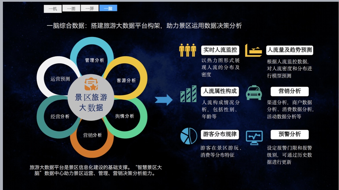 通过智慧旅游大数据平台实时监测全域范围内的各个系统,给产业发展提供决策性的数据支撑。大力推动旅游科技创新,打造旅游发展科技引擎,建设旅游产业大数据平台,建设全国旅游产业运行监测平台,建立旅游跟公安、交通、统计等部门数据共享机制,形成旅游产业大数据平台。